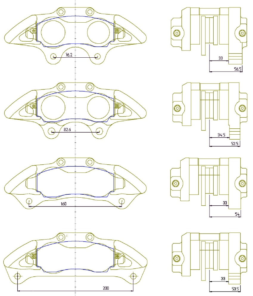 ● Four large pistons to give equal and balanced braking. ● Stainless steel wear plates. ● Billet aluminium body (6082 T6). ● Optional staggered bores. ● High temperature EPDM seals. ● Billet aluminium pistons (6082 T6). ● Dust boots. |